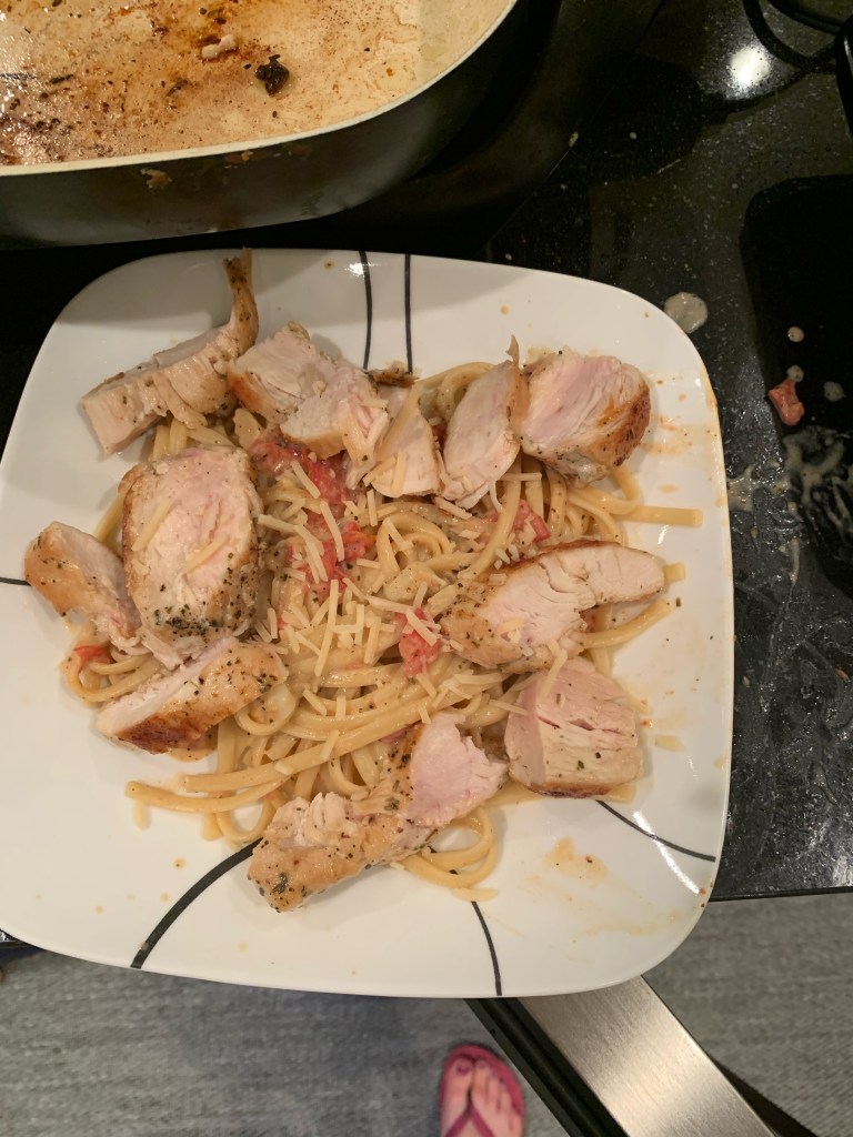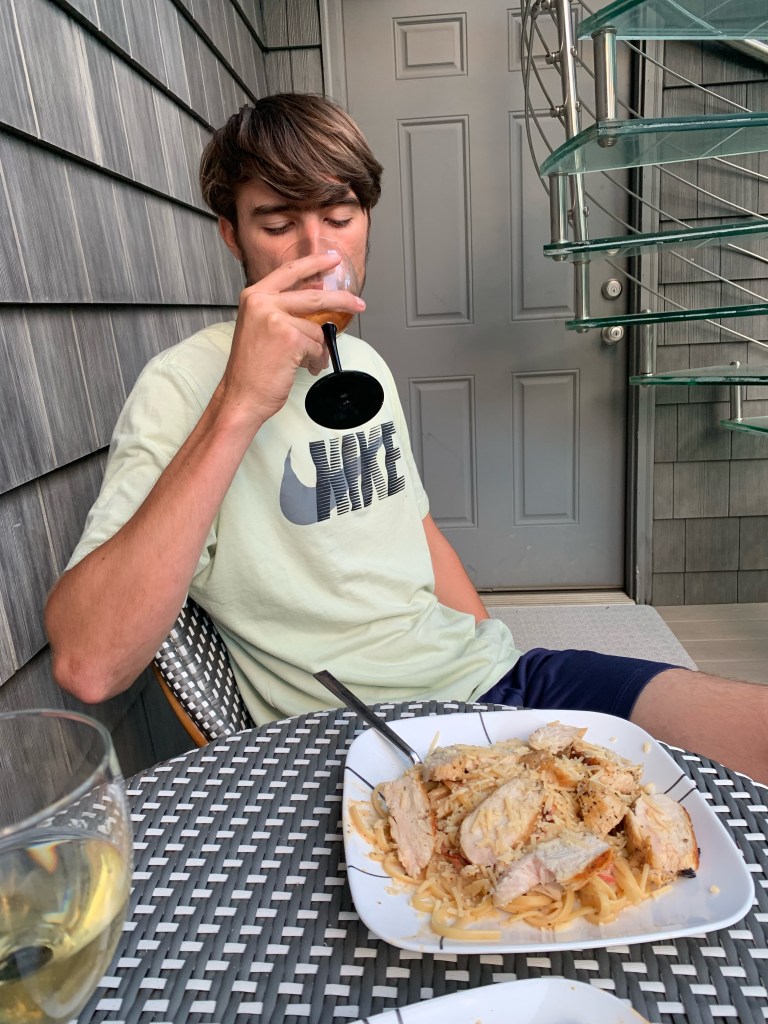After many minutes down winding, scenic roads, we were finally here. And the space is very impressive, it almost feels like a space fit for singles and couples. After a grocery trip, I started making dinner, which will turn out to be a game of hide and seek. That’s the only complaint about this space which is the kitchen. I’m sure the host didn’t think much about the cooking when putting this place together because a lot of equipment are either not there or they’re in a different room, making the whole experience much less enjoyable. For dinner, I made Tuscan chicken linguine, which luckily Brennan enjoyed with a glass of wine. The dinner was really good, very creamy and also has a kick to it thanks to the Tuscan spice. Brennan recommended us to not have our phones while we had dinner outside, and I gotta say, it was very enjoyable. We had great conversations, a great meal, and the weather is perfect. After dinner and after I washed the dishes, we took a bath, which is more like a mini pool than a bath…big, and played some games.