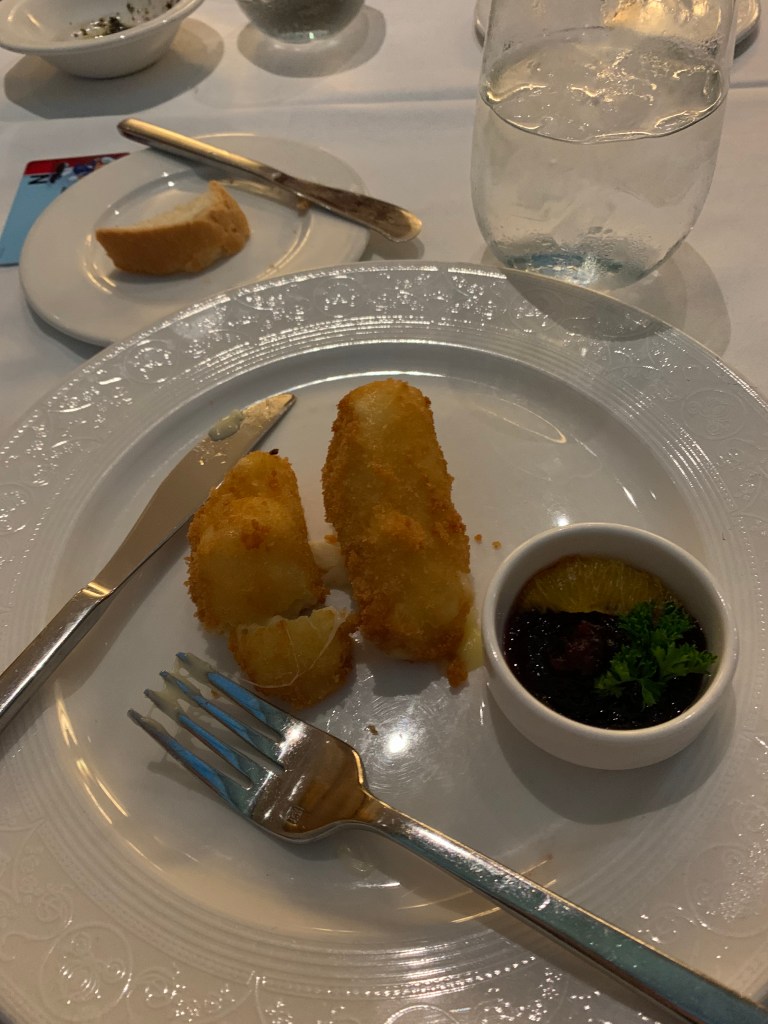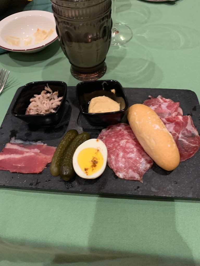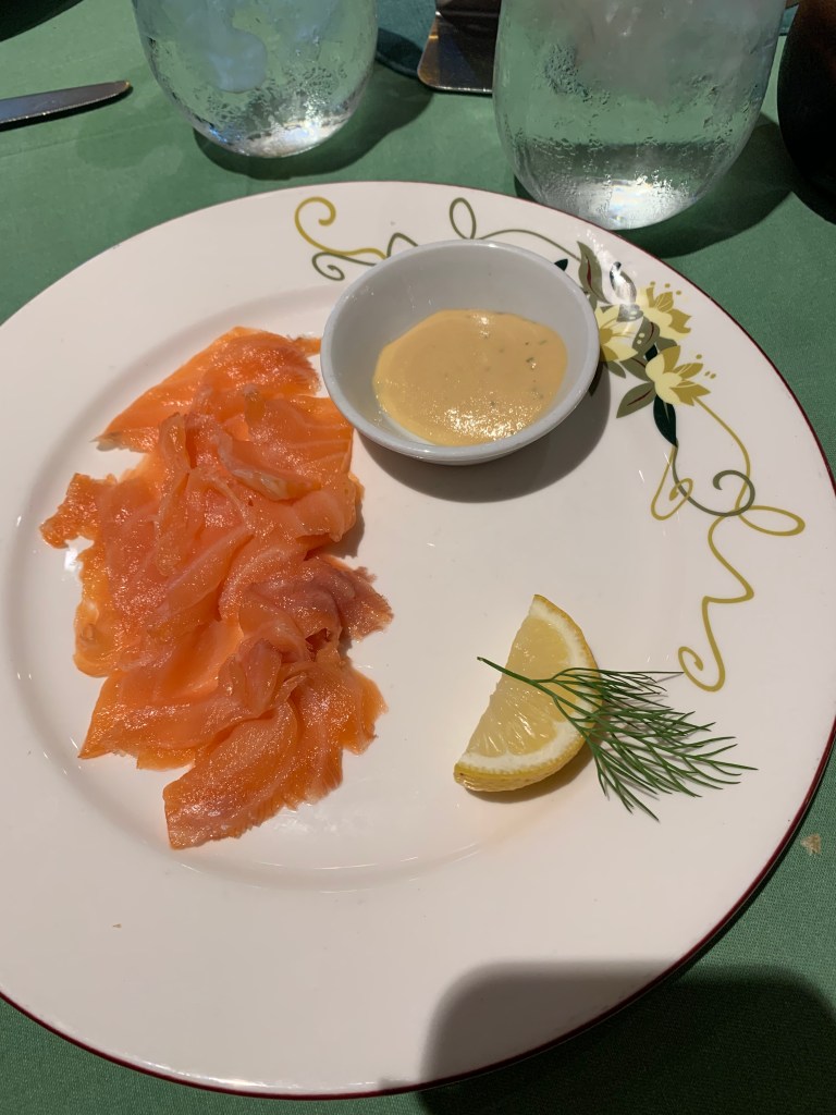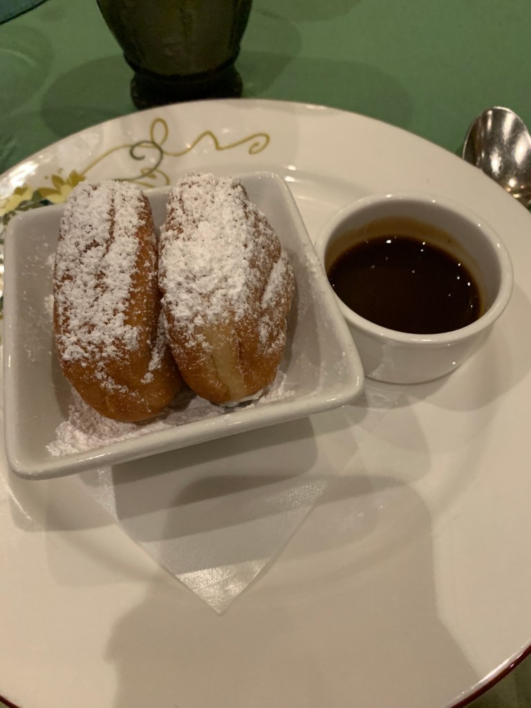 For dinner, I had a charcuterie board, tomato soup, salmon and Tiana’s beignets. I gotta say that the soup was really good, the others, not alot to say about it. But we did have fun with the powdered sugar by blooping the noses of each other. Mom and I were laughing at dad when he ordered the tartar due to an experience with it while we were in Paris years ago. Speaking of mom, she did not eat much during the entire trip, let alone her main course! All due to her having a low appetite these days.