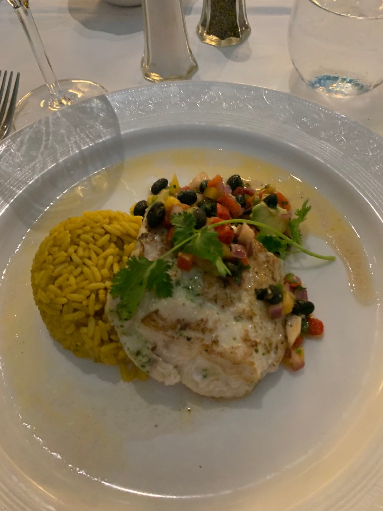 We had dinner before the deck party, and we went to Triton’s again but we had a special pirate night menu. I got the crab cake (all three of us got it), the carrot soup, grouper filet, and chocolate cake. As usual, the crab cake is delish, in fact the first time I tried crab cake was on a boat; a river cruise to be exact. The soup was interesting, the fish tastes like Mexico or has a certain flavor that makes you think of Mexico, and the cake was too much due to the rum sauce on top. One of our waiters, Laura, helped de-shell mom’s dish and it was one of the sweetest things ever. During dessert, it was my turn to get the cake for my college graduation so that’s really nice.