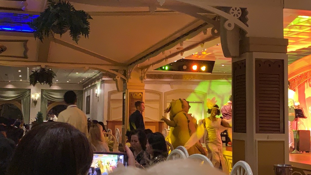 For the first time during the entire cruise, I beat my parents to our seat. Normally, I was a bit late so that was a small victory. Tiana’s Place is basically your Roaring 20s jazz club in N’Orleans. Tiana was wearing her all white flapper outfit which was a stark contrast to her typical green dress. And speaking of roaring, we were literally above the engine that was shaking the quake up, even the lights were shaking!