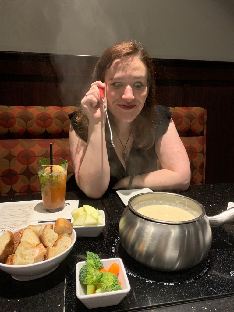 With this first photo, it’s kind of funny. So, me and my best friend would celebrate our birthdays together in the middle of the month (hers is 8/08 and mine is 8/30). So that was a couple years ago and it was our first time at the Melting Pot. That was our first course, the cheese fondue and that’s just a face of “ooooh you’re going to get it!” I’ve first tried cheese fondue in Switzerland eight years ago and loved it.