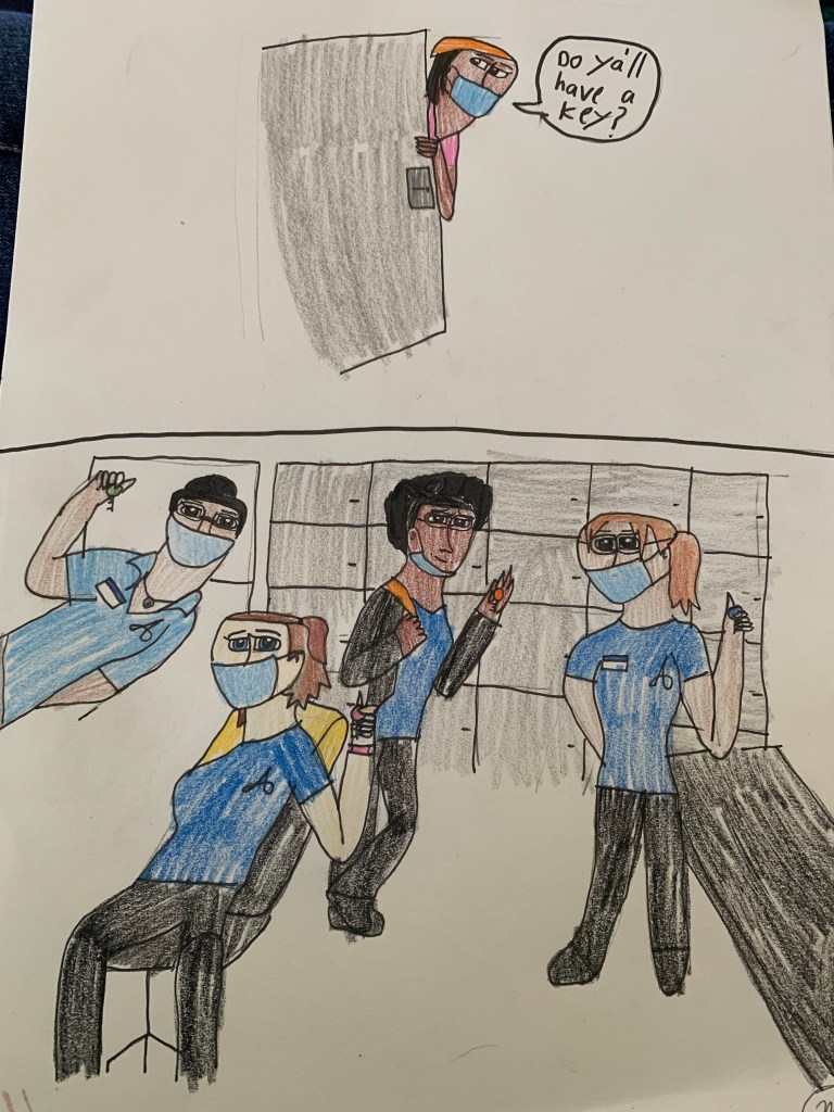 This last photo was a very funny one and it actually happened! One night, when I was working as a healthcare worker, we were all waiting for that one more graveyard worker to show up. We as in me and 3 other caregivers. We were just waiting in that somewhat cramped staff room with no windows, having conversation. When that one graveyard worker shows up and asks anyone for a key to start their shift, no joke all four of us unhooked our work keys from our shirts and almost like hand it to her. It was so funny that I had to draw it. In fact, this was my first drawing in a long time and I used to draw all the time. What was the coworkers’s reaction to it? They love it! One of them, Kat, said we show hang it up in the staff room. Also with the masks, it was the same month we had an inner facility COVID outbreak and yes, I got covid and no it was not fun.